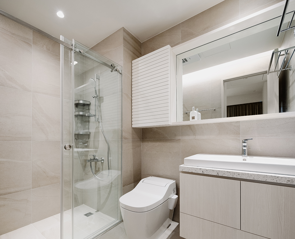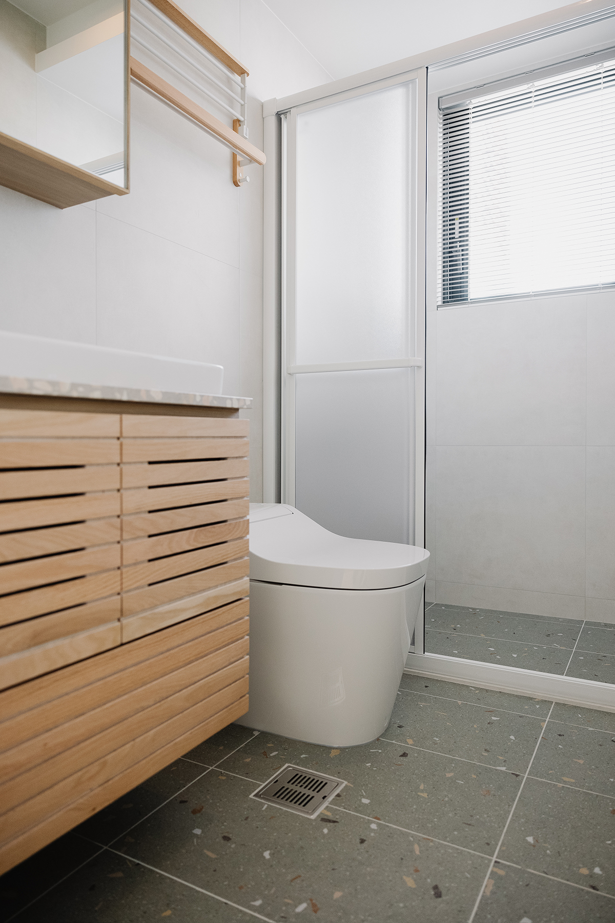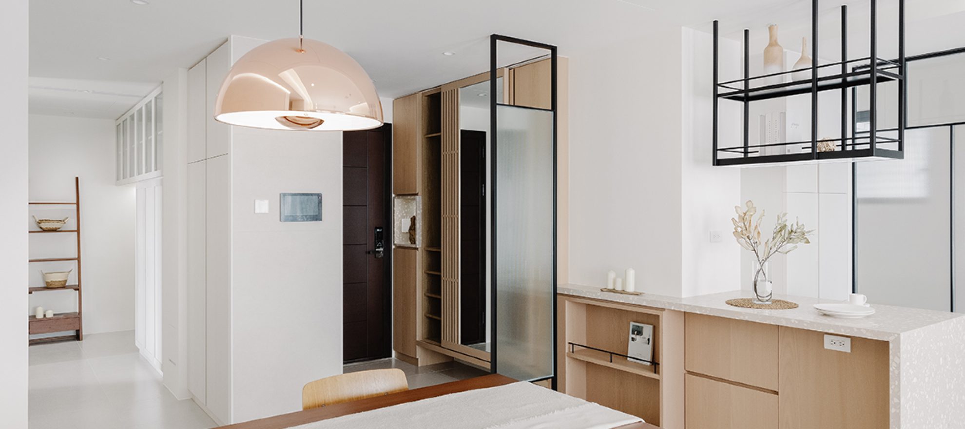 因為業主家庭成員多,需要五個房間:主臥、三個小孩房,以及一間客房,還有大量的家庭收納需求。以此為基準,更改後的配置,空間分佈上除了主臥和客房外,其他房間的大小相似,客廳、餐廳、中島區沒有隔間,空間延伸讓視覺感受上變得更寬敞,客廳的兩樘對外窗,讓整個空間採光充足。玄關的部分,我們在鞋櫃上特別製作了一個穿衣鏡拉門,使用方便也不占空間;從多次的討論中,我們感受到屋主一家緊密的關係,由此發想,我們在玄關的另一側做了玻璃展示櫃,讓一家人美好的回憶放在這個每天進出家門都能看到的地方。