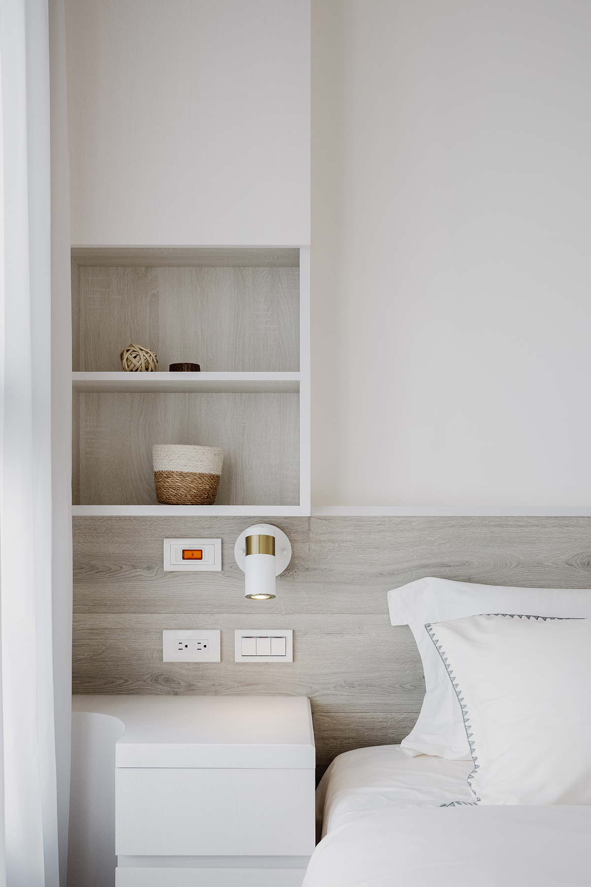 整個家色系的設定,因為人數的關係,預計日後的東西一定不少,所以在材料、顏色選擇上比較簡單質樸,替空間視覺減少一點負擔,考量到全屋整體的和諧,房間內材質亦挑選偏素雅的色系。全室牆面雖沒有多作跳色,但我們在電視牆和餐廳牆面貼上有紋理的磁磚,在燈光下可以發現光影的細節;家裡因為牆面轉折多,直角也多,所以我們在一些轉角和桌角等地方,用圓弧造型修飾,減少空間的銳利感。