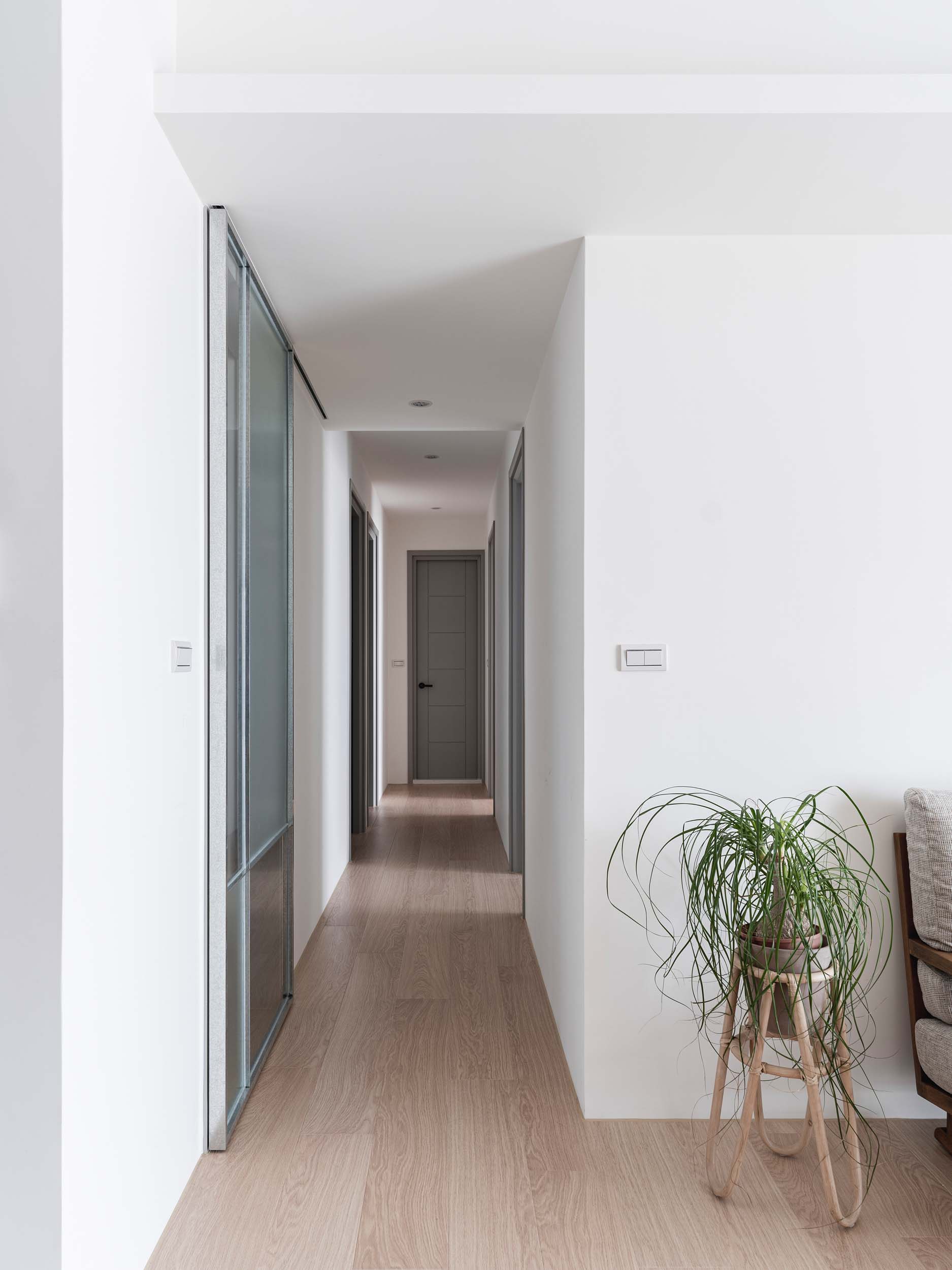 在做住家的空間設計時,風水是一項很常被討論的事情,在這個案子裡玄關門打開直接對著陽台,這種門對窗的情況就是一般風水裡所說的”穿堂煞” 在處理這個問題時我們不希望只是用一道牆擋住來解決,在與屋主溝通後與其擋住那個”無形的氣”不如讓採光更好些,於是我們在玄關的屏風上選擇了金屬和FRP格網來做搭配,金屬堅固且厚度可以做比較薄,FRP格網在工廠製作比較不費工成本相對便宜,這樣的設計讓玄關屏風看起輕盈,入門時視覺被隔網分割並保有穿透性和採光,空間上也更有變化。