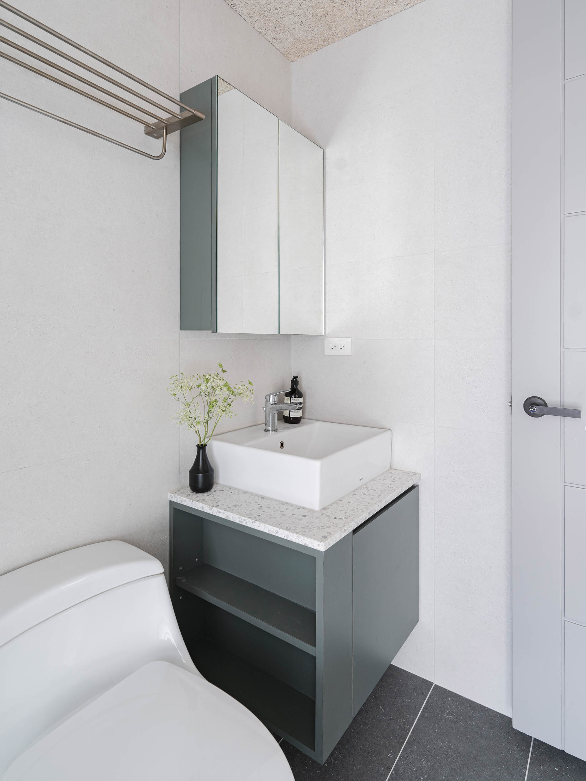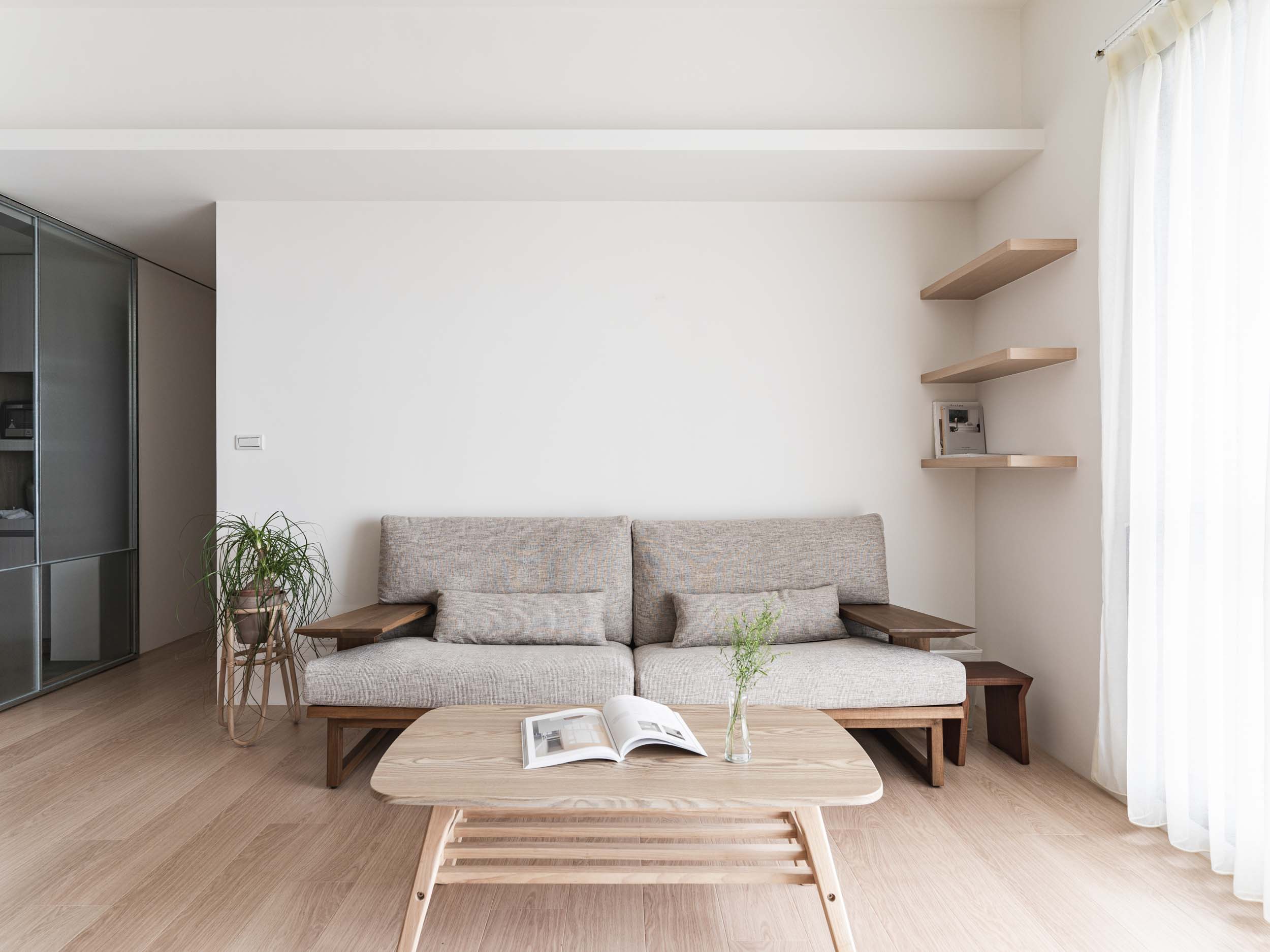 客廳用了”樂土塗料”從玄關一直做到電視主牆,長形的牆面因為有顏色的關係讓空間有了主題和延伸性,主臥床頭板選擇跟地板一樣的超耐磨木地板直貼牆上,讓材質簡單統一;整個空間木作只做了幾個層板、電視櫃、局部天花板,讓空間適度留白保有調整的彈性;餐桌上屋主選了一個金屬吊燈不僅跟玄關金屬屏風戶相呼應也成為空間的焦點,期待日後增添喜歡家具空間的樣子。