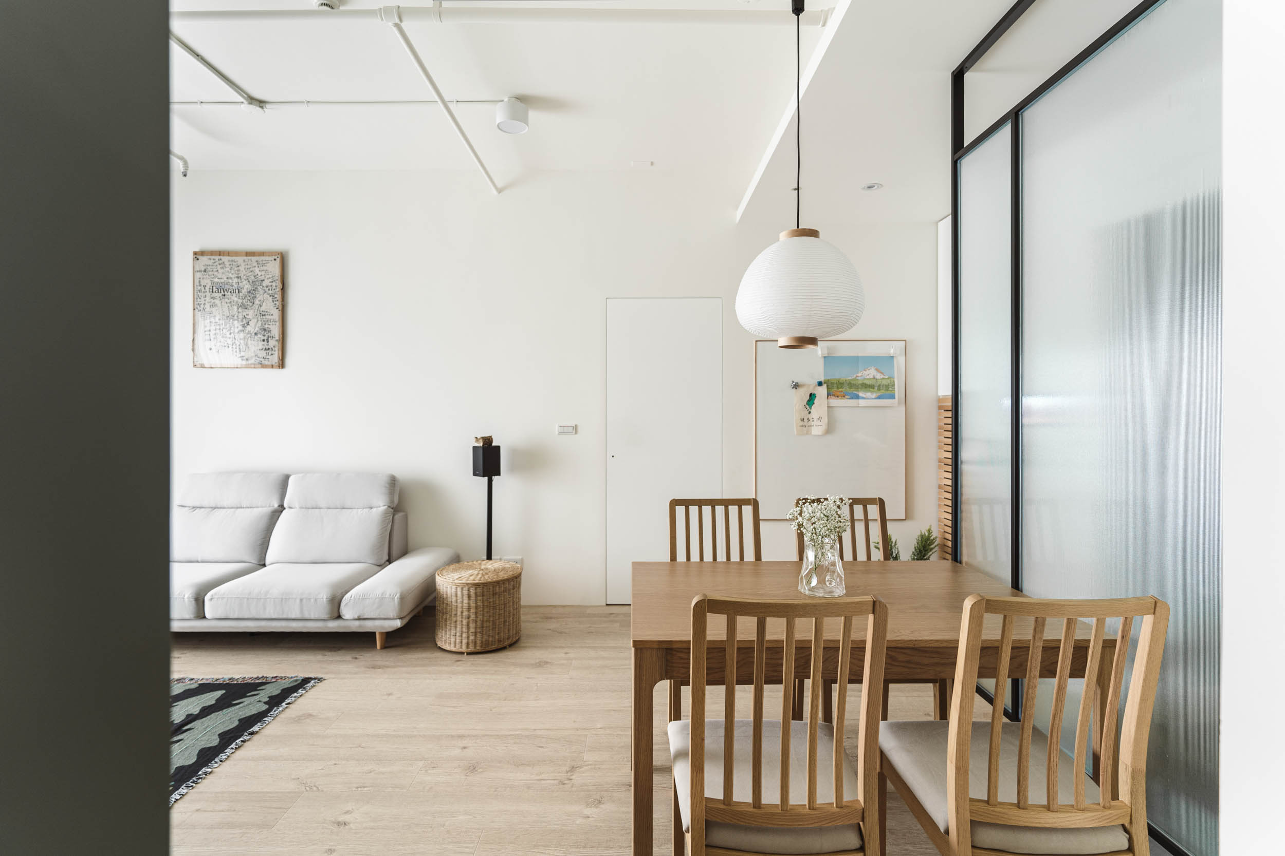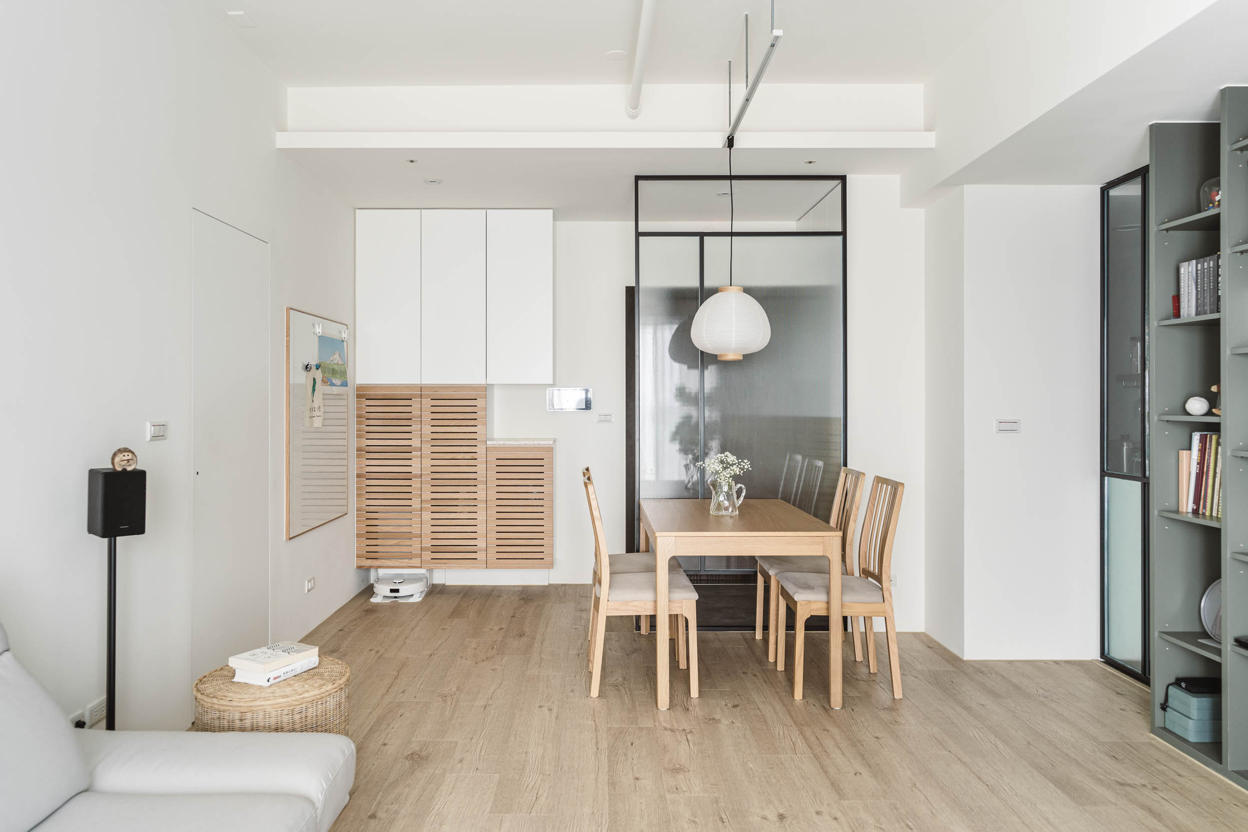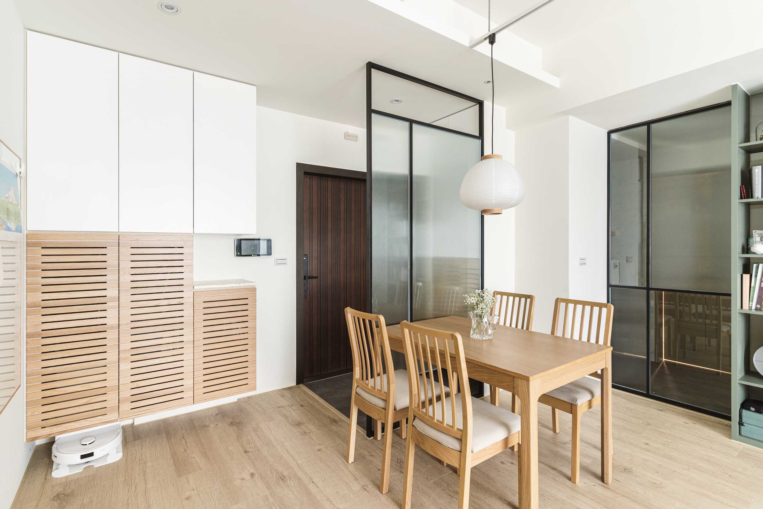 在丈量完成配平面時,發現這是一個能清楚分開公私領域的空間,除了主臥室跟著客廳相鄰,於是我們把主臥室的門改成暗門,隱藏在牆之中,讓客廳感覺可以更完整;廚房、客房及工作室的區域用了鐵件拉門跟客廳做一個區隔,拉門上使用玻璃讓光線和視線通透,整體空間感也不會生硬的被阻隔。