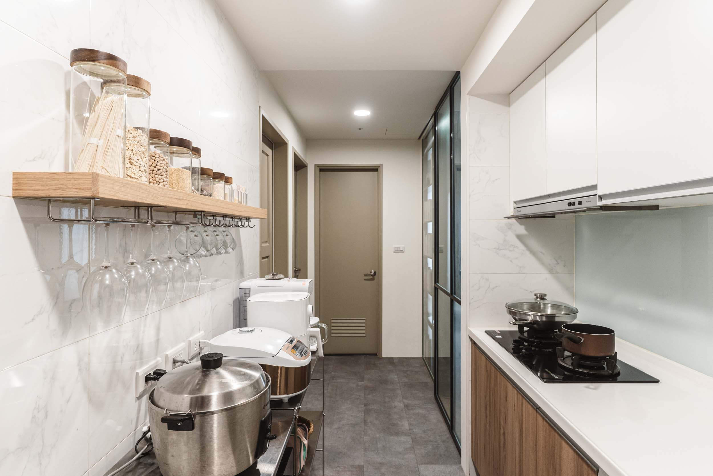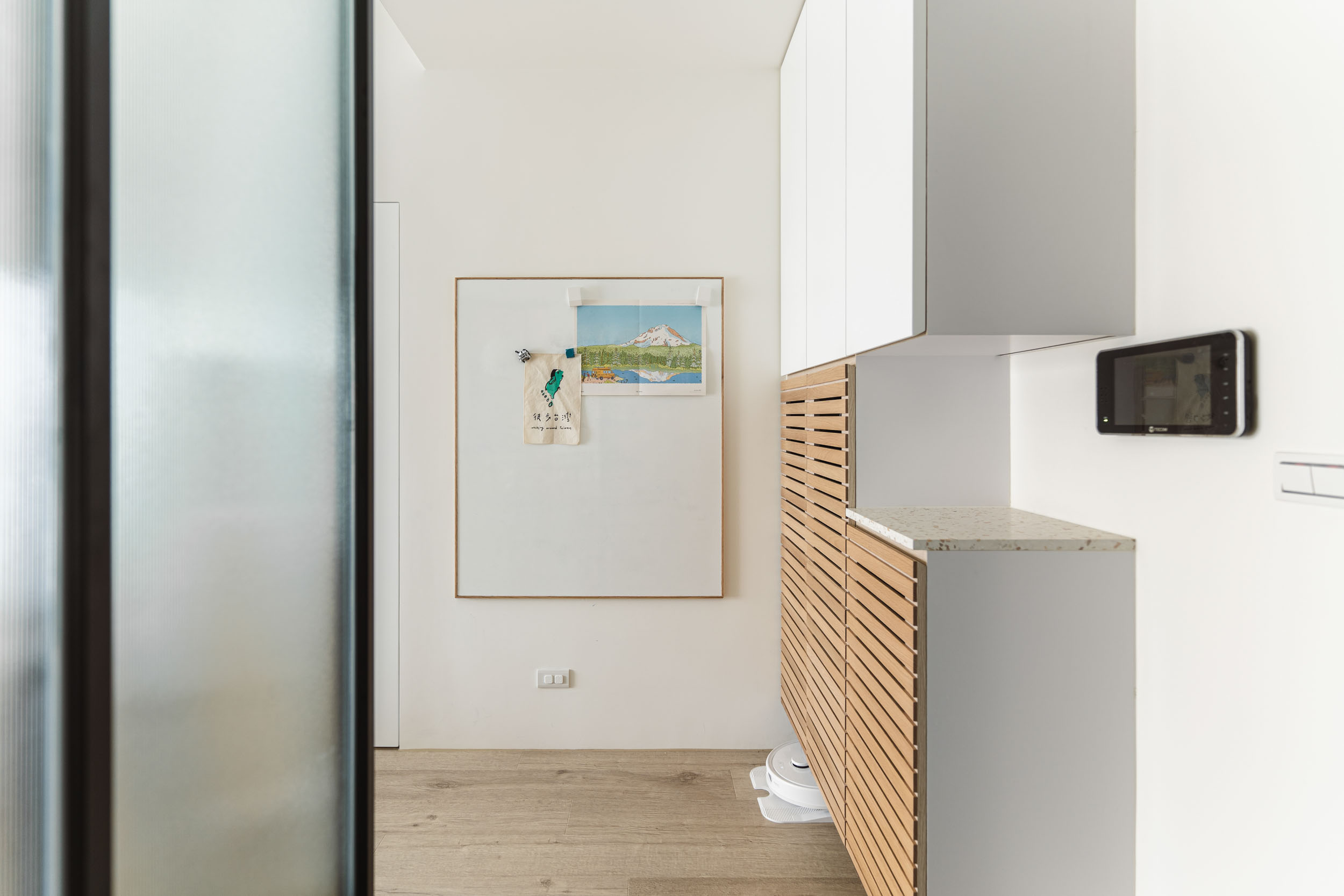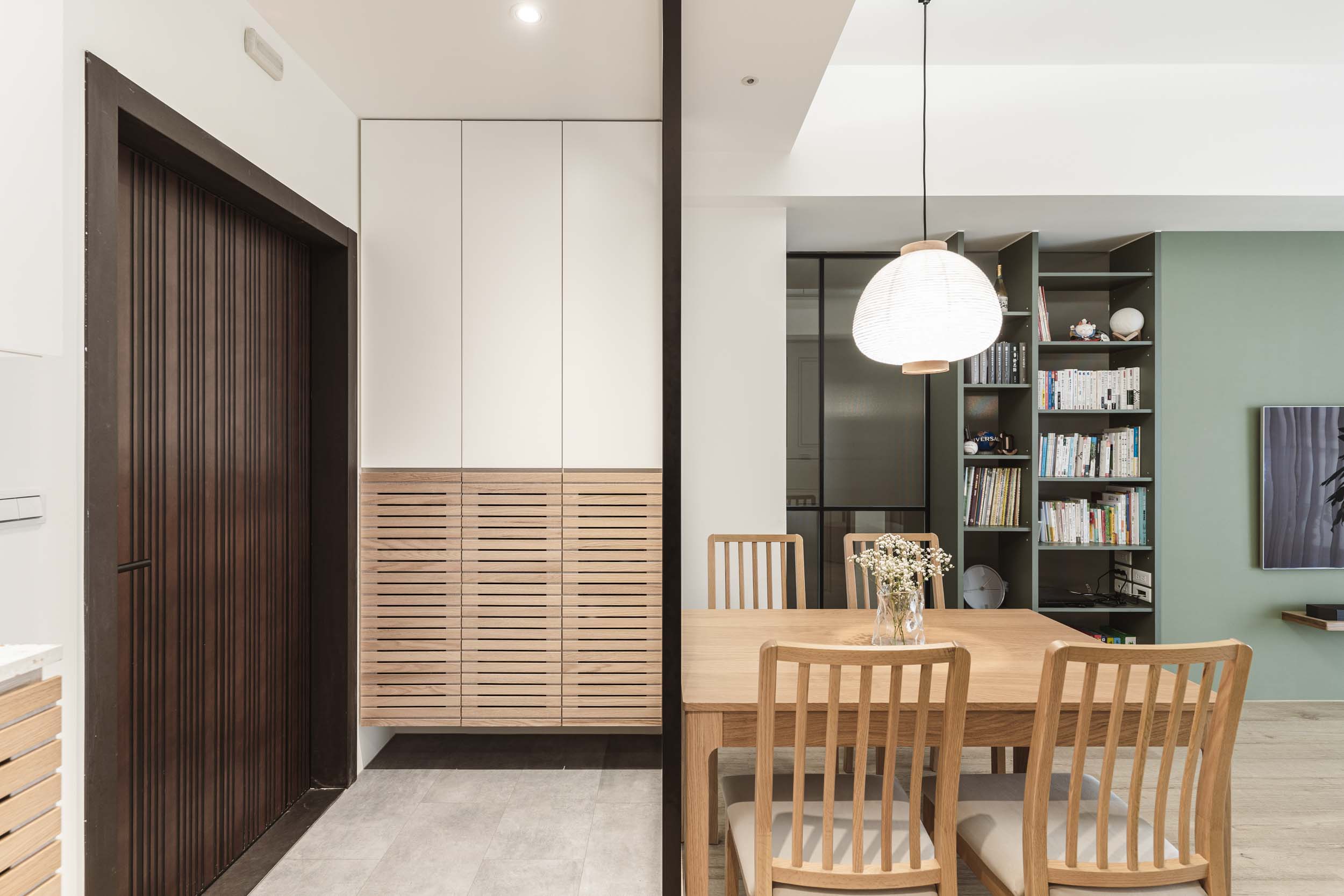 在丈量完成配平面時,發現這是一個能清楚分開公私領域的空間,除了主臥室跟著客廳相鄰,於是我們把主臥室的門改成暗門,隱藏在牆之中,讓客廳感覺可以更完整;廚房、客房及工作室的區域用了鐵件拉門跟客廳做一個區隔,拉門上使用玻璃讓光線和視線通透,整體空間感也不會生硬的被阻隔。