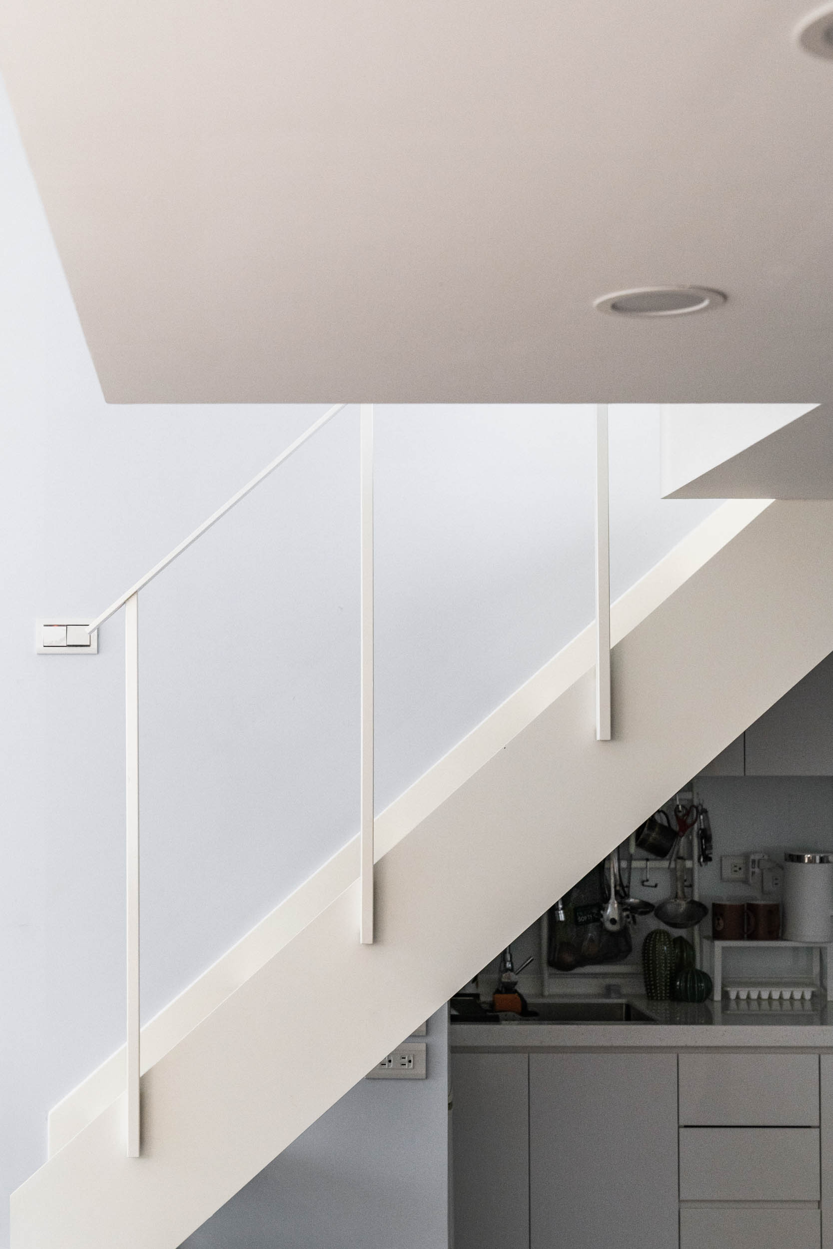 整個空間因為偏小所以在油漆的選擇上用了彩度偏低的顏色,希望在視覺不要太過強烈並保有輕柔感,整體來說希望透過”空間整理”讓上中下層空間都得到妥善的運用是這個案子的核心。