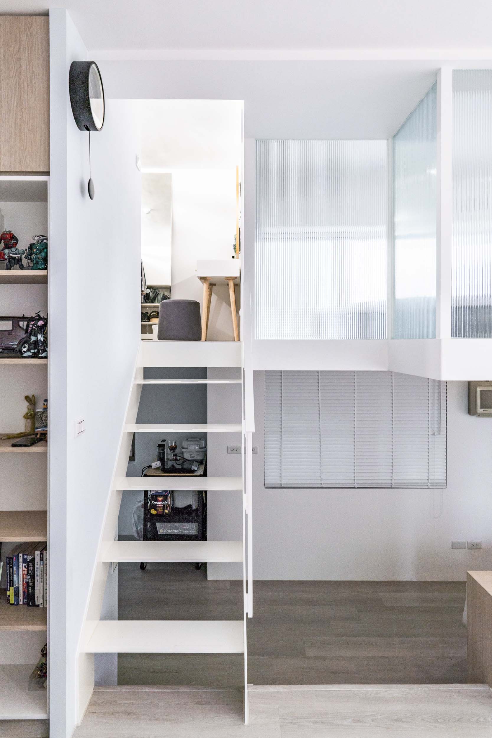 以空間高低分為上、中、下層,上層臥室夾層地板畸零,我們先把夾層拉齊讓空間更完整好用,並做了從中層至上層的高櫃增加收納空間,臥室的隔間用了透光不透視的直紋玻璃讓光線更多穿透至客廳,在中層客廳也不至於感覺上層特別壓迫。