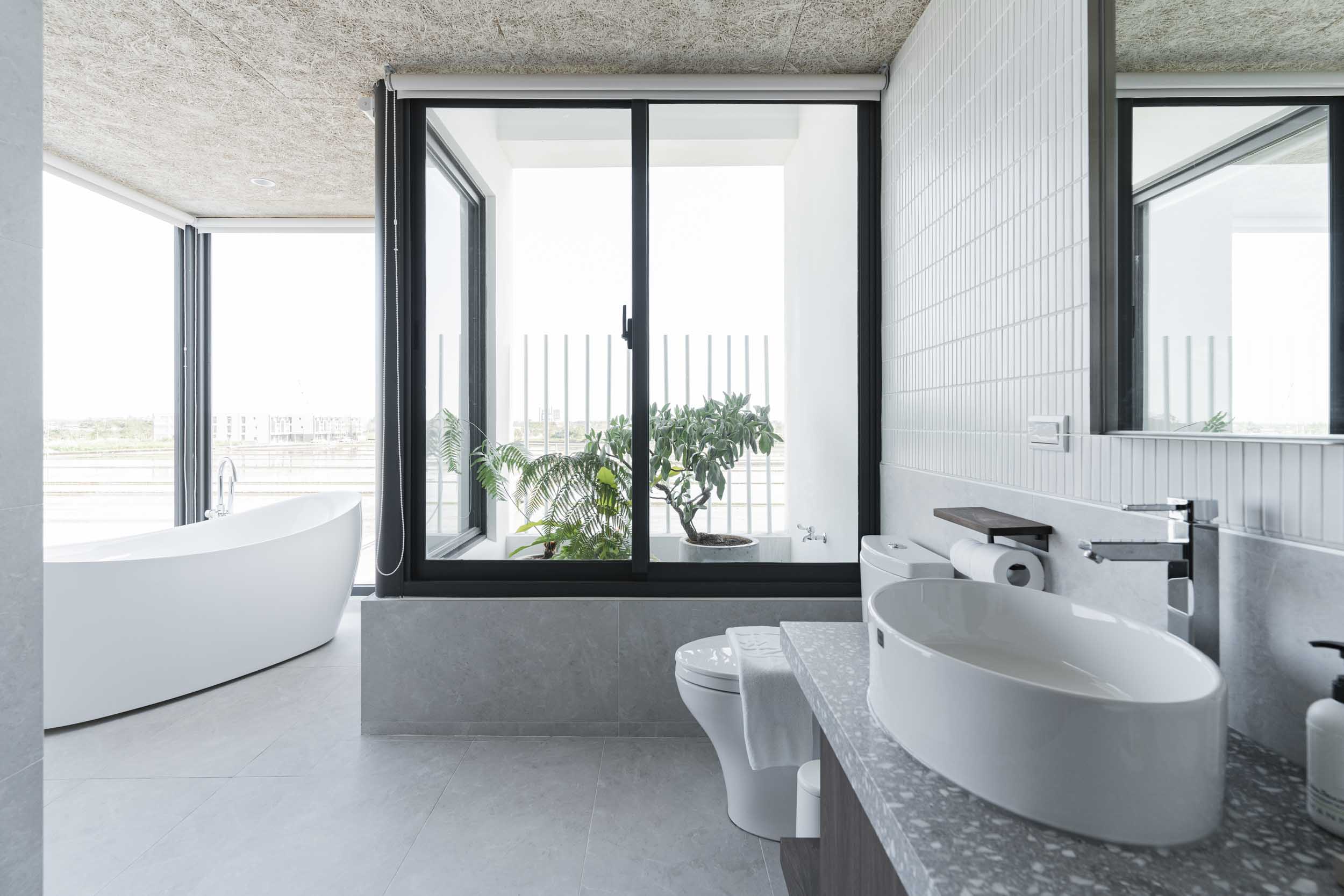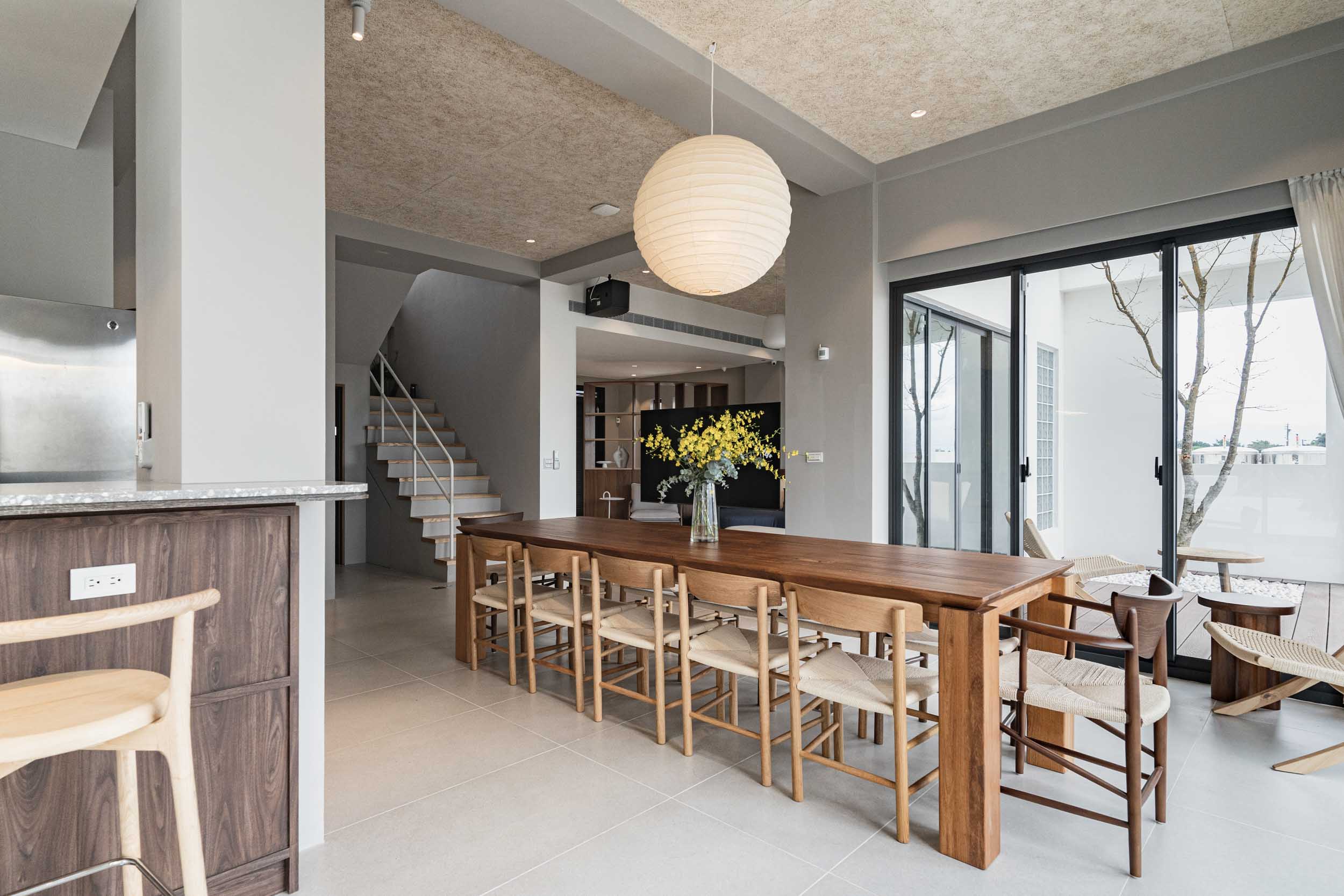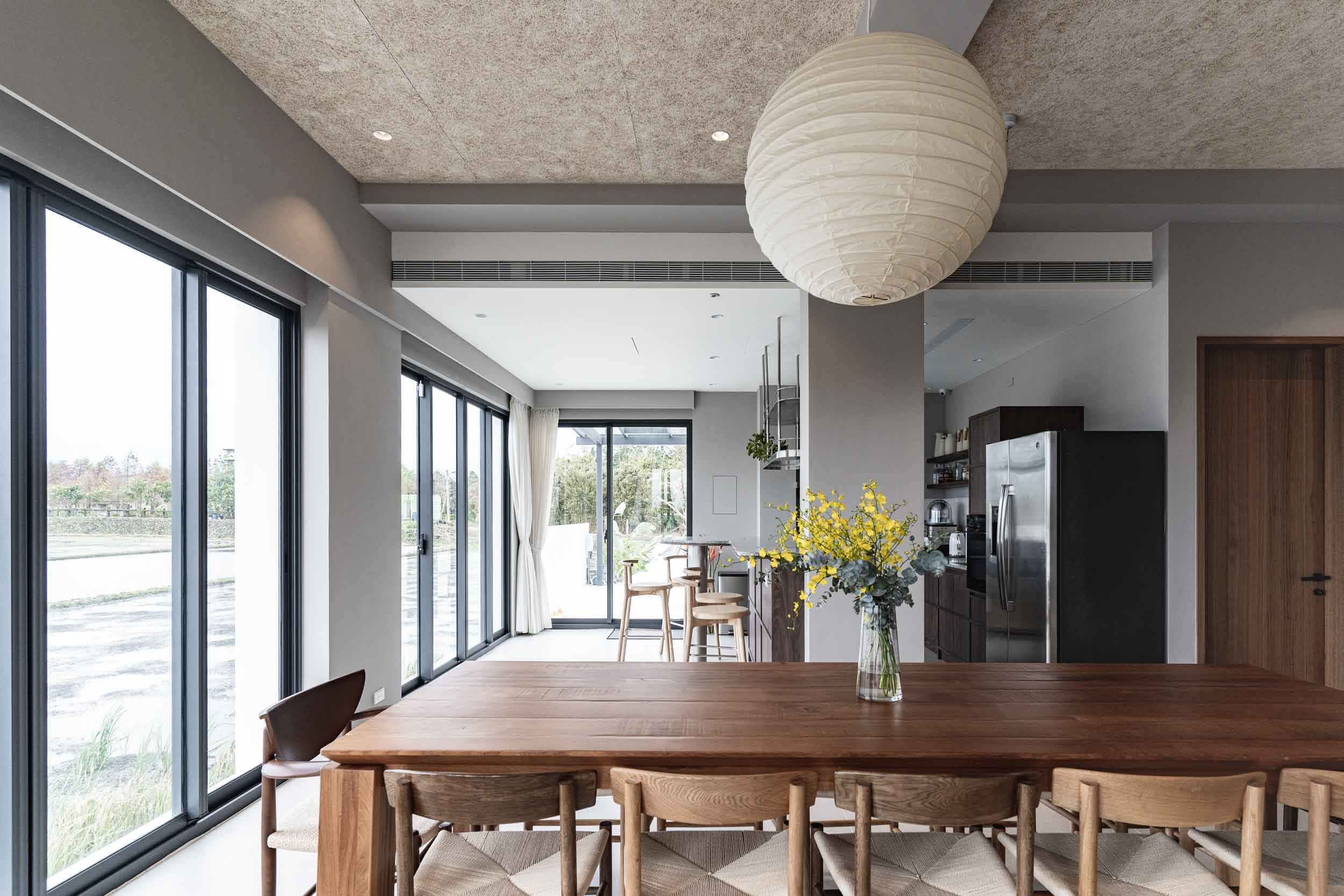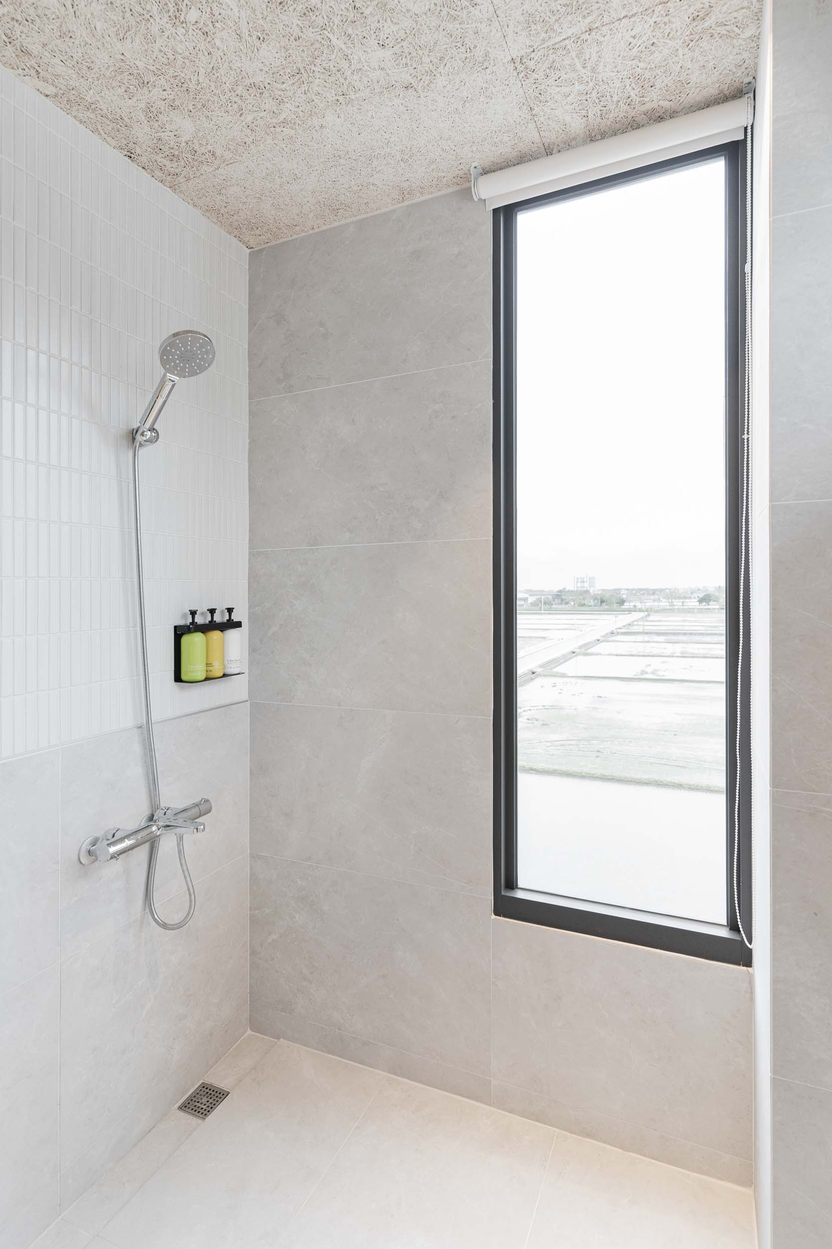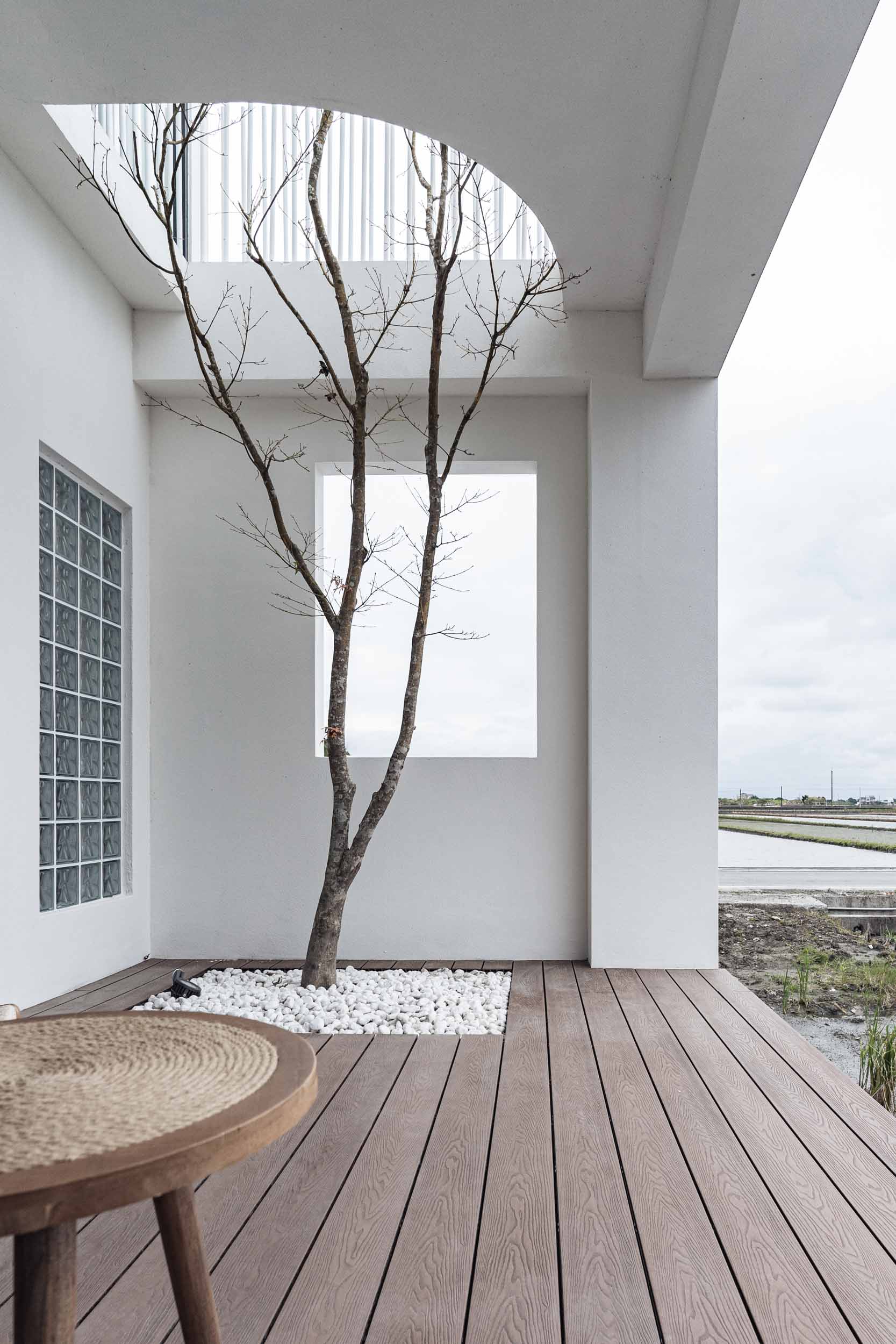 民宿位於宜蘭,建於兩塊田地之間,原本建築規劃一樓面稻田側是封實牆的,我們覺得非常可惜,因此在參與增建部分設計時,建議在結構安全的原則下,把一樓的牆改成落地窗,讓我們可以”借景”使客廳和餐廳、廚房的視野和採光更好;客廳的對外側也規劃了戶外陽台,陽台上種了一顆樹,更為了這棵樹在2樓房間陽台開了一個洞,除了讓樹有更多的生長空間,也能跟我們更靠近。能夠有一棵樹陪伴生活是我的理想,很開心這個想法能夠應用在本案,樹種是選落葉喬木的”黃金楓”,是和業主去苗圃時一眼就看中的 ,雖然會變色會掉葉,但也讓民宿在季節轉換下有不同的風情;2、3樓的客房區,除了依循著我們的設計策略,在材料上選擇溫暖舒適的顏色外,還有一個特色: 浴室面積幾乎占了房間的1/3,因為浴室剛好在增建設計範圍又面稻田側,於是我們有了大膽開窗的想法,通常浴室因為隱私問題很少會開大窗,但業主有一個邊泡澡邊欣賞田園風光的夢幻想像,所以也很贊成我們的提案,於是衛浴空間也成了重點區域,而因為大量開窗也讓建築外觀變得更有趣,不再是生硬的立方體;整棟建築物包括外牆、欄杆等都是以白色為基調,雖然很有可能因為下雨生苔需要更多維護成本,但為了呈現整體的簡潔和俐落感,我們覺得白色是適合投資的,戶外的部分,車道選擇了碎石取代硬鋪面,除了節省預算外,對於多雨的宜蘭也能有更好的地面洩水功能,後面庭院造景區選了好種耐濕的落羽松和有度假氛圍的雞蛋花,簡單的配置希望能滿足活動需求但也不落俗套。