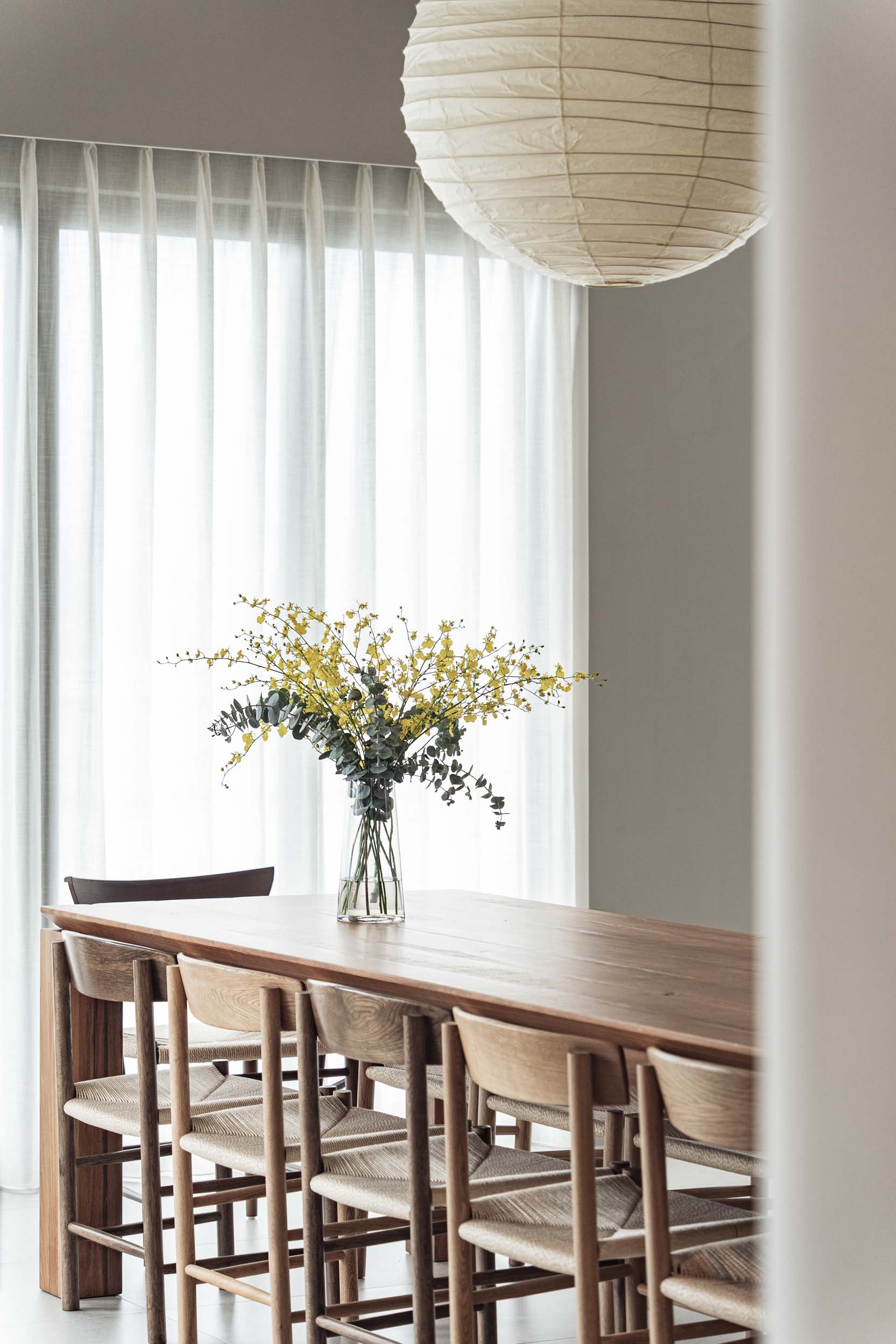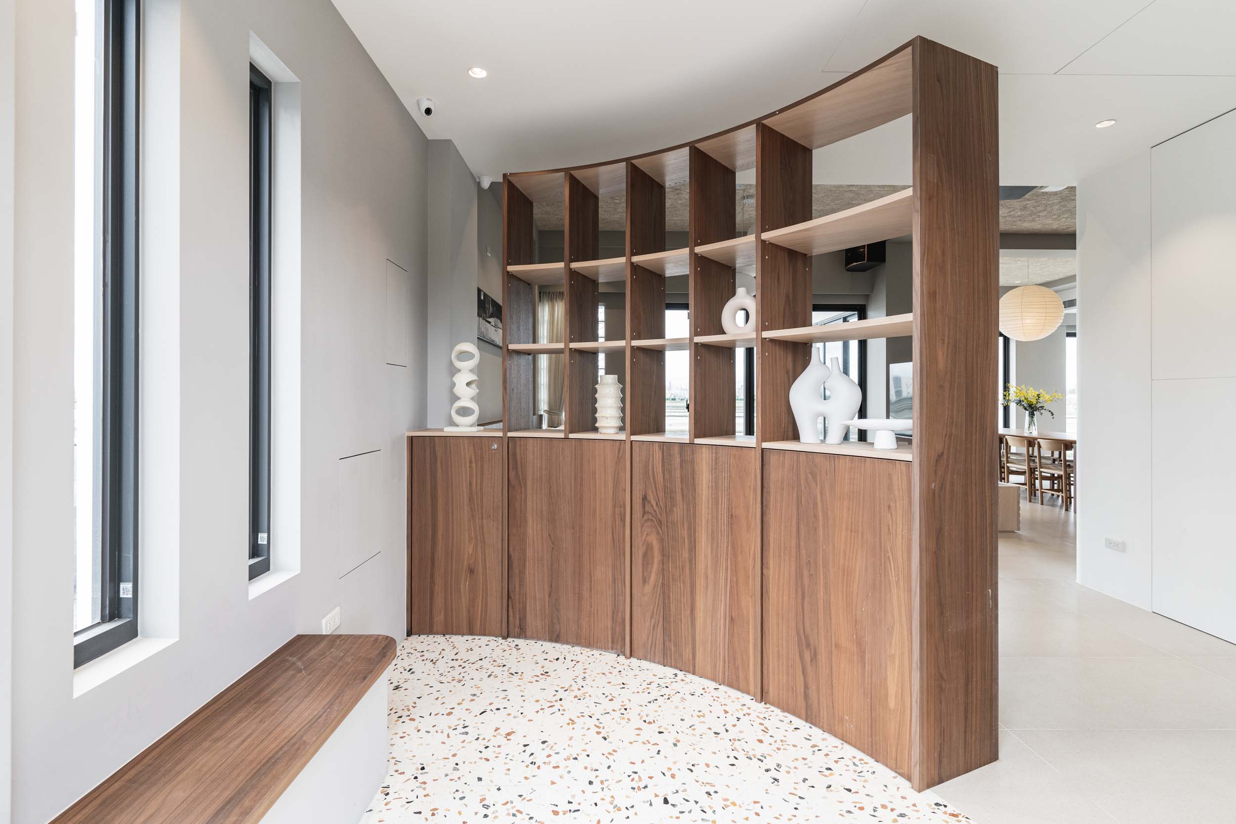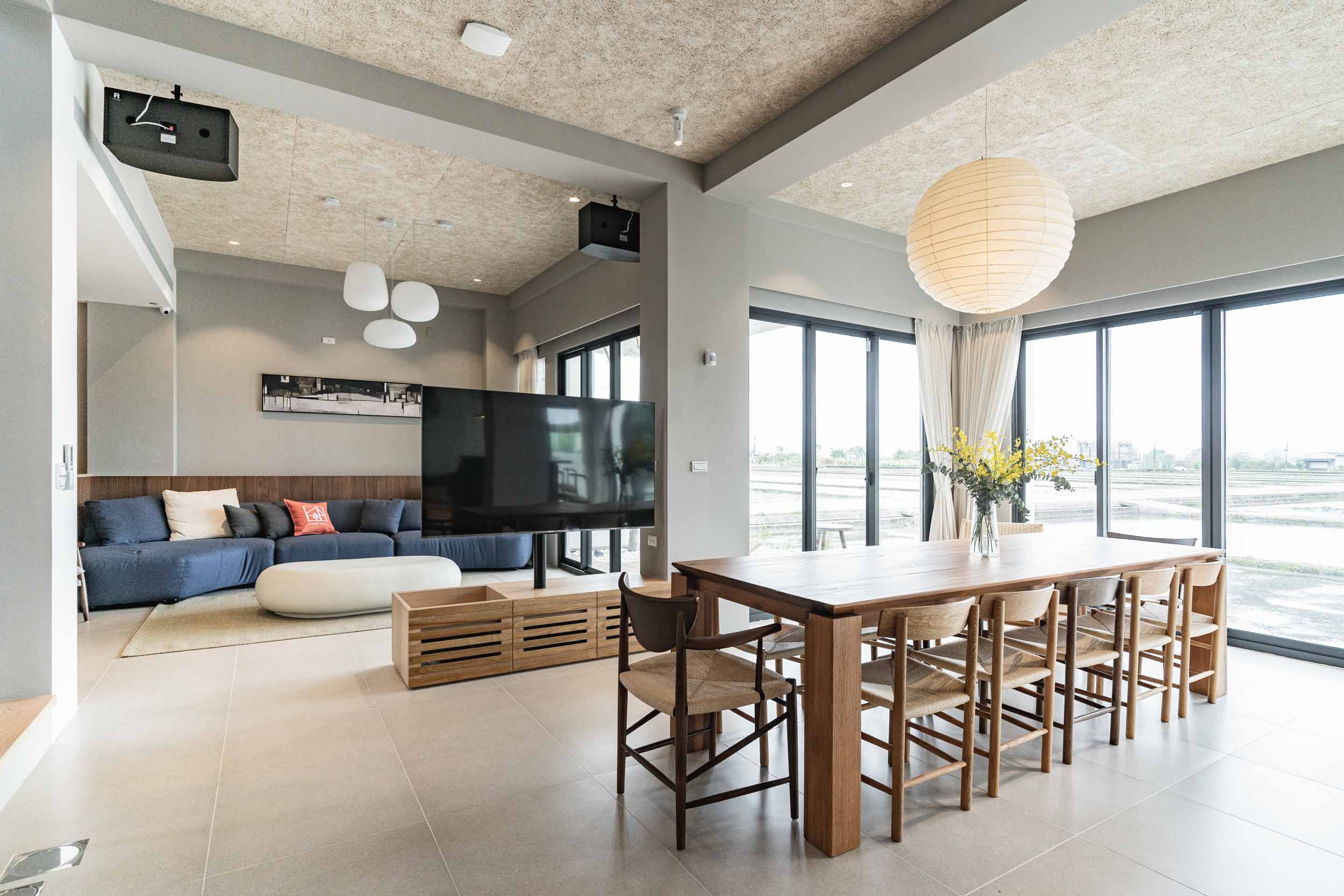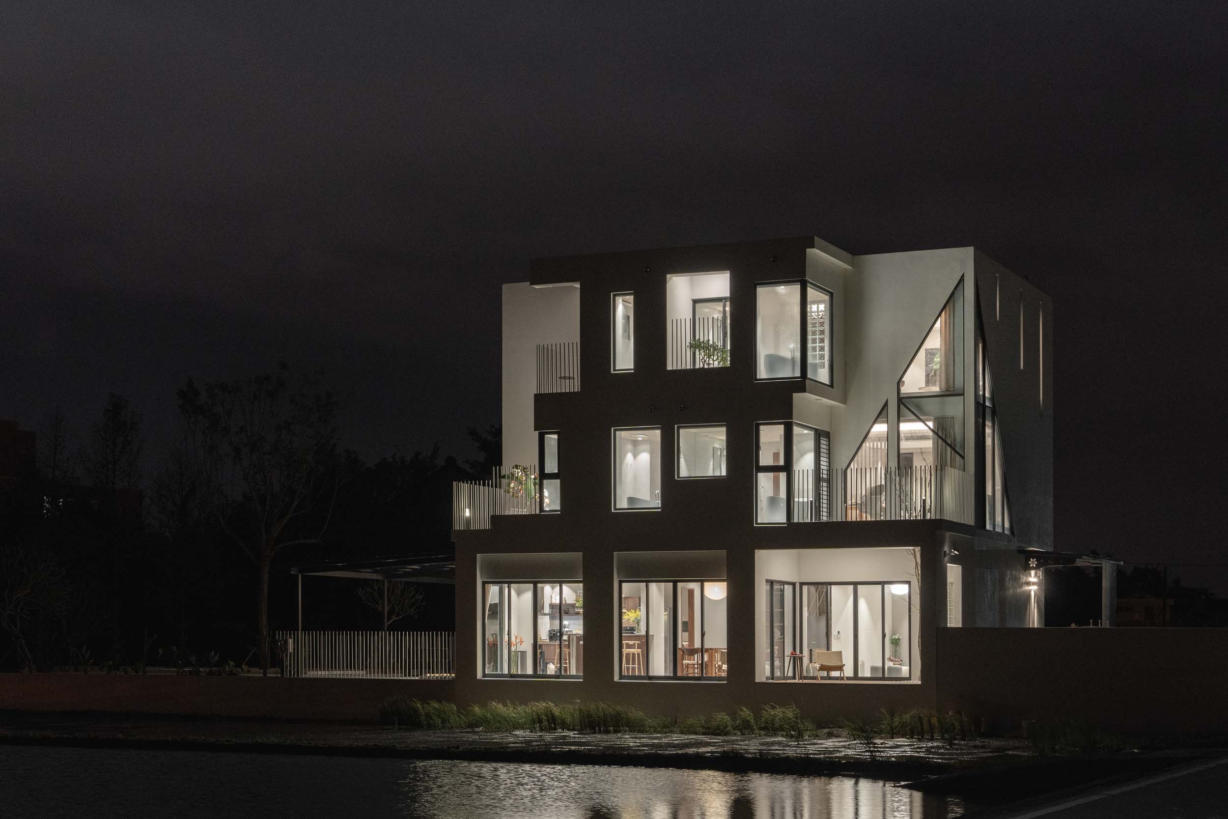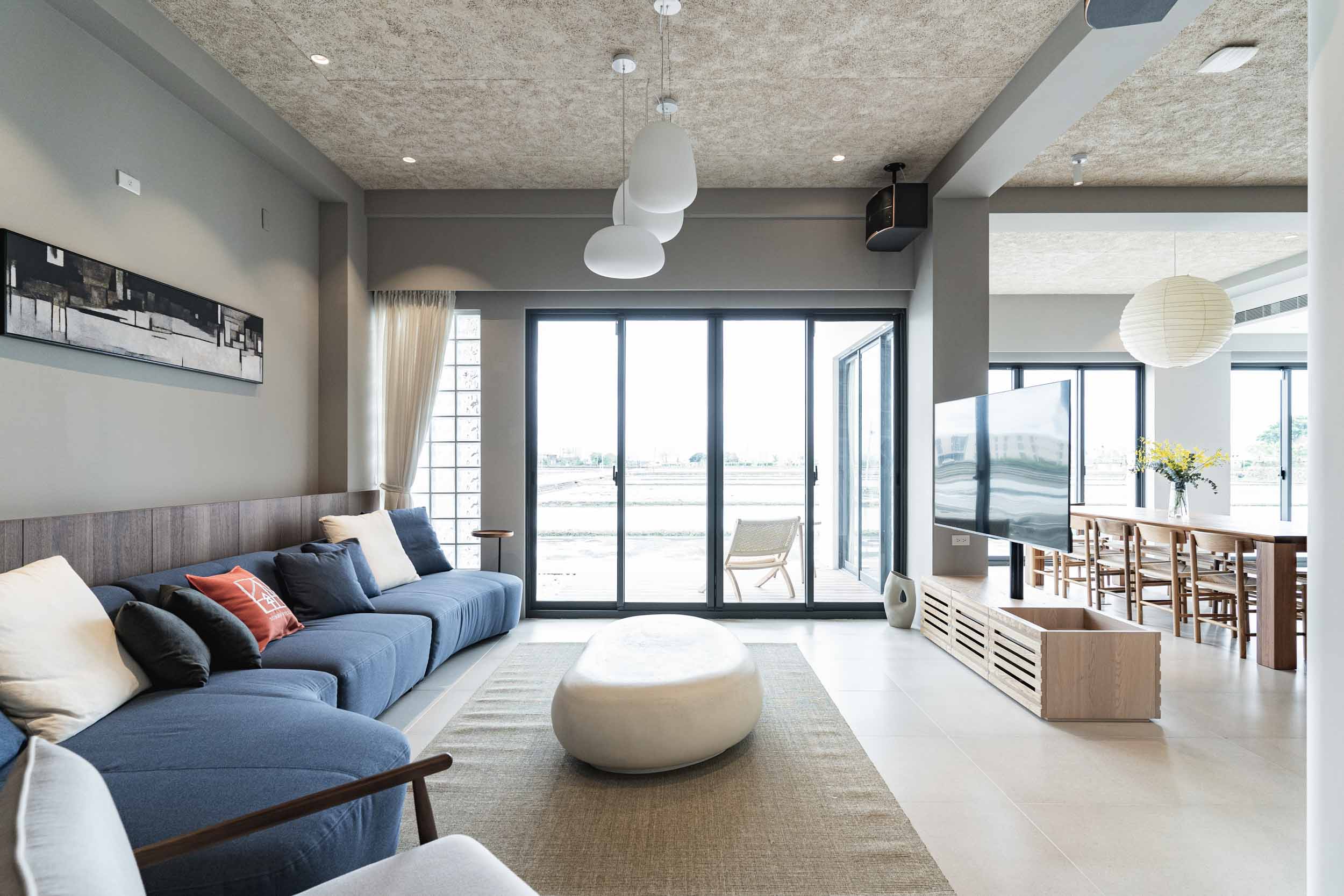民宿位於宜蘭,建於兩塊田地之間,原本建築規劃一樓面稻田側是封實牆的,我們覺得非常可惜,因此在參與增建部分設計時,建議在結構安全的原則下,把一樓的牆改成落地窗,讓我們可以”借景”使客廳和餐廳、廚房的視野和採光更好;客廳的對外側也規劃了戶外陽台,陽台上種了一顆樹,更為了這棵樹在2樓房間陽台開了一個洞,除了讓樹有更多的生長空間,也能跟我們更靠近。能夠有一棵樹陪伴生活是我的理想,很開心這個想法能夠應用在本案,樹種是選落葉喬木的”黃金楓”,是和業主去苗圃時一眼就看中的 ,雖然會變色會掉葉,但也讓民宿在季節轉換下有不同的風情;2、3樓的客房區,除了依循著我們的設計策略,在材料上選擇溫暖舒適的顏色外,還有一個特色: 浴室面積幾乎占了房間的1/3,因為浴室剛好在增建設計範圍又面稻田側,於是我們有了大膽開窗的想法,通常浴室因為隱私問題很少會開大窗,但業主有一個邊泡澡邊欣賞田園風光的夢幻想像,所以也很贊成我們的提案,於是衛浴空間也成了重點區域,而因為大量開窗也讓建築外觀變得更有趣,不再是生硬的立方體;整棟建築物包括外牆、欄杆等都是以白色為基調,雖然很有可能因為下雨生苔需要更多維護成本,但為了呈現整體的簡潔和俐落感,我們覺得白色是適合投資的,戶外的部分,車道選擇了碎石取代硬鋪面,除了節省預算外,對於多雨的宜蘭也能有更好的地面洩水功能,後面庭院造景區選了好種耐濕的落羽松和有度假氛圍的雞蛋花,簡單的配置希望能滿足活動需求但也不落俗套。
